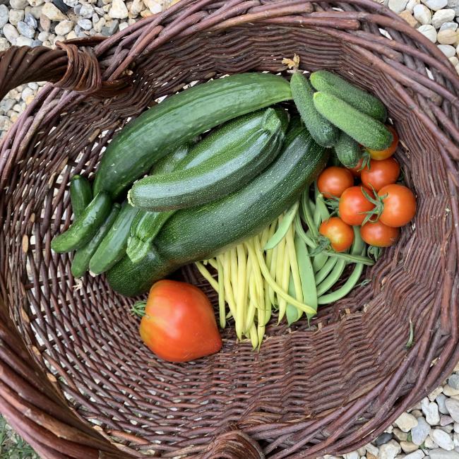Het is druk in de tuin en in de keuken deze maand juli. Het is dan ook de eerste echte oogstmaand. Er is een overvloed aan groentes in de tuin. Fruit hebben we pas net aangeplant, dus daar hebben we minimale oogst van, alleen om zo in de tuin van te snoepen. Maar de groentes..... die gaan lekker zeg! Ik loop dus elke dag een rondje door de tuin met mijn mand om te oogsten. De eerste vleestomaat hebben we op! Dat vind ik een heel proces hoor: tomaten.... als eerste zie je de bloemetjes en hoop je op de bijtjes ;-). Dan komt er een klein vruchtje wat groter groeit, maar nog helemaal groen is en dan duurt het echt nog wel weken totdat de rode kleur verschijnt! Maar als die er eenmaaal is, is er ook geen houden meer aan! Ik heb laatst 100 weckpotten op marktplaats gekocht, dus kom maar op met die tomaten!